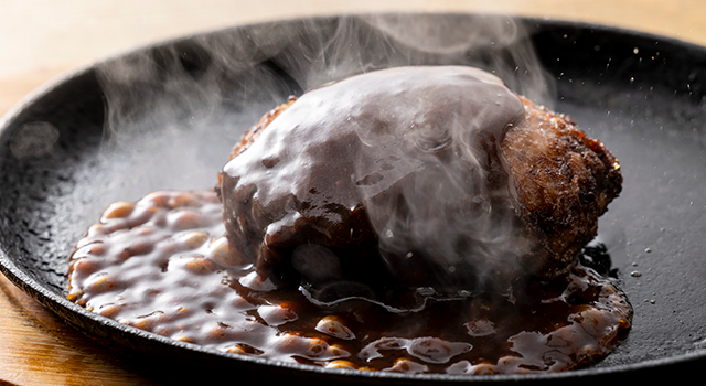 毎朝その日に使用する分だけお肉を挽いて、ミンチにしていますので新鮮なお肉を味わっていただくことができます。アツアツの鉄板で、肉汁たっぷりジューシーなハンバーグはボリュームも満点で、食べ盛りのお子様から大人のお客様まで、すべての方にご好評いただいているお料理となっております!